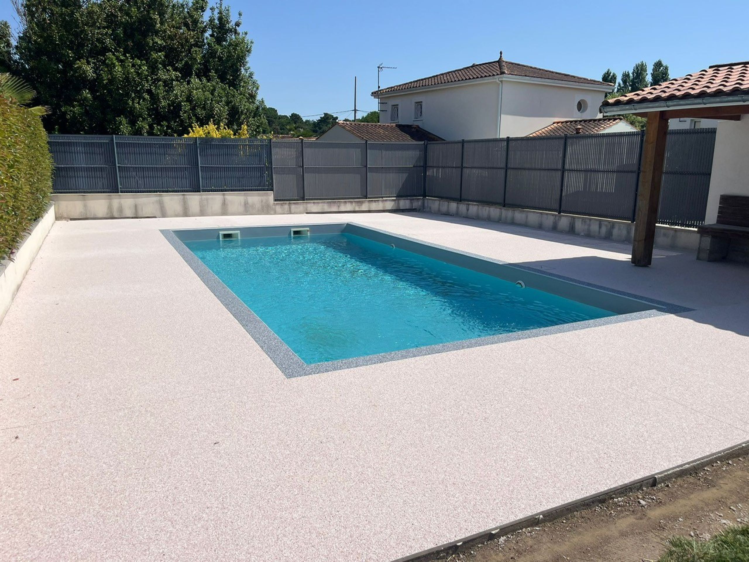 Autour d’une piscine, il est recommandé de poser la moquette de pierre sur une épaisseur de 10 mm minimum. Elle peut être de 12 à 15 mm selon la planéité du support. Cette épaisseur garantit une bonne résistance mécanique, un confort de marche optimal et une longévité renforcée, même en cas d’usage intensif pendant la saison estivale.