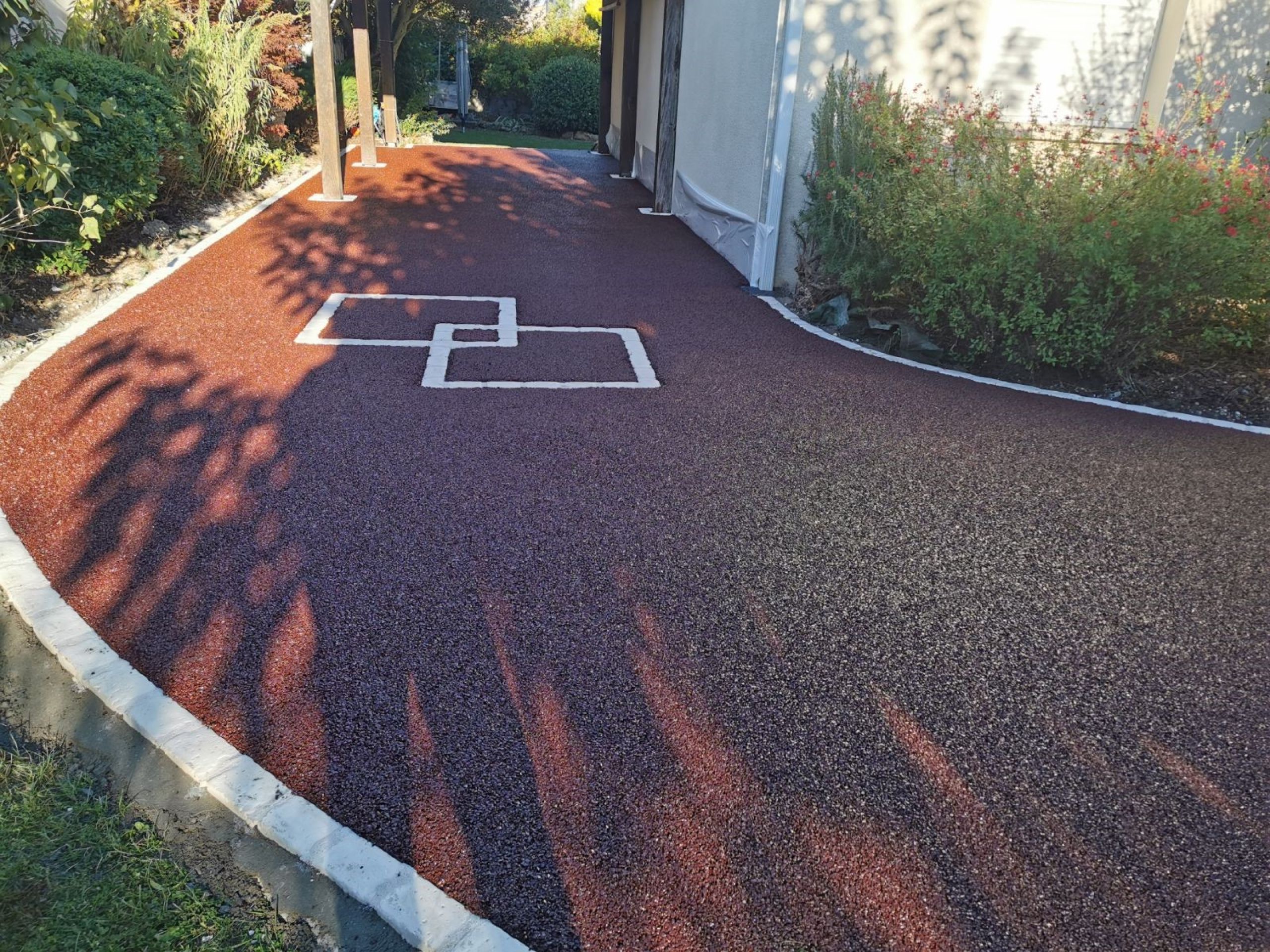 Enfin, l’enrobé peut être noir ou rouge. Dans le cas d’un enrobé rouge, il faut savoir que durant quelques mois lors des pluies, un peu de colorant rouge se collera aux chaussures. Ce n’est pas un probablement venant de la fabrication ou de la mise en œuvre,c’est le refus de colorant en surface (le surplus) qui une fois évacué par les eaux de pluie se stabilisera.
