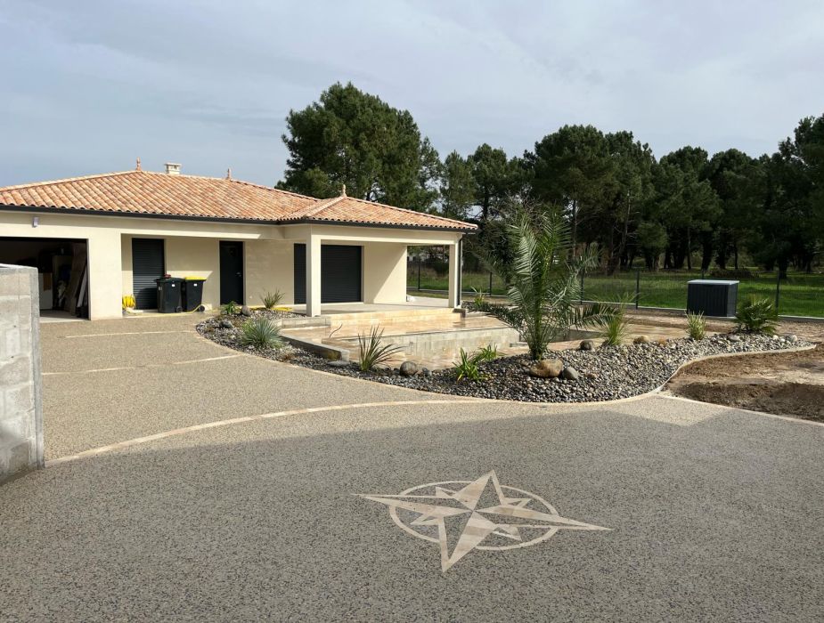 Sur cette villa neuve ,nous avons conçu tout les aménagements extérieurs, le mur de clôture, la plage de piscine en travertin, les jardinières et enfin l’allée de la maison en béton désactivé avec sa rosace en pavés.