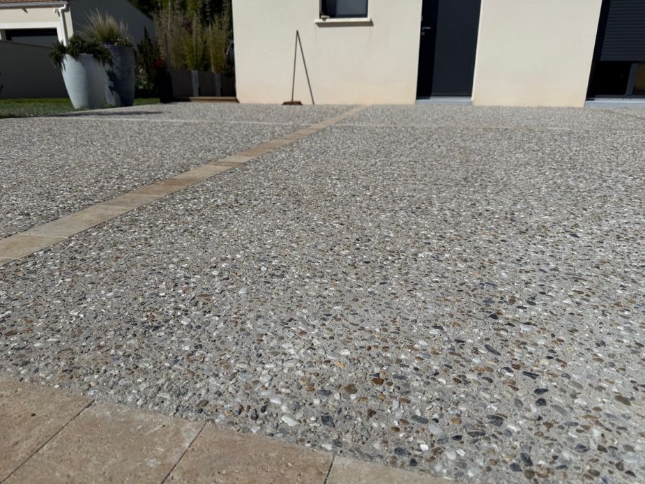 Le client voulait une cour associant esthétique et praticité tout en gardant l’aspect cailloux apparents.