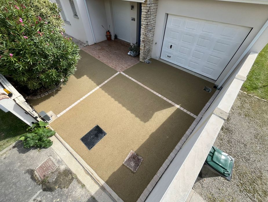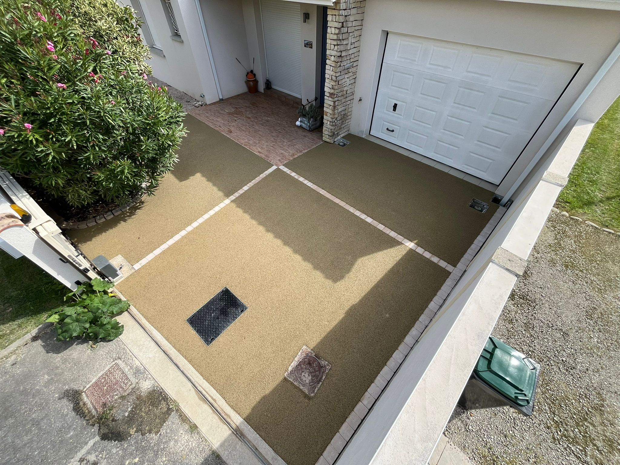 Réalisation d’un béton drainant de couleur beige pour cette allée carrossable.