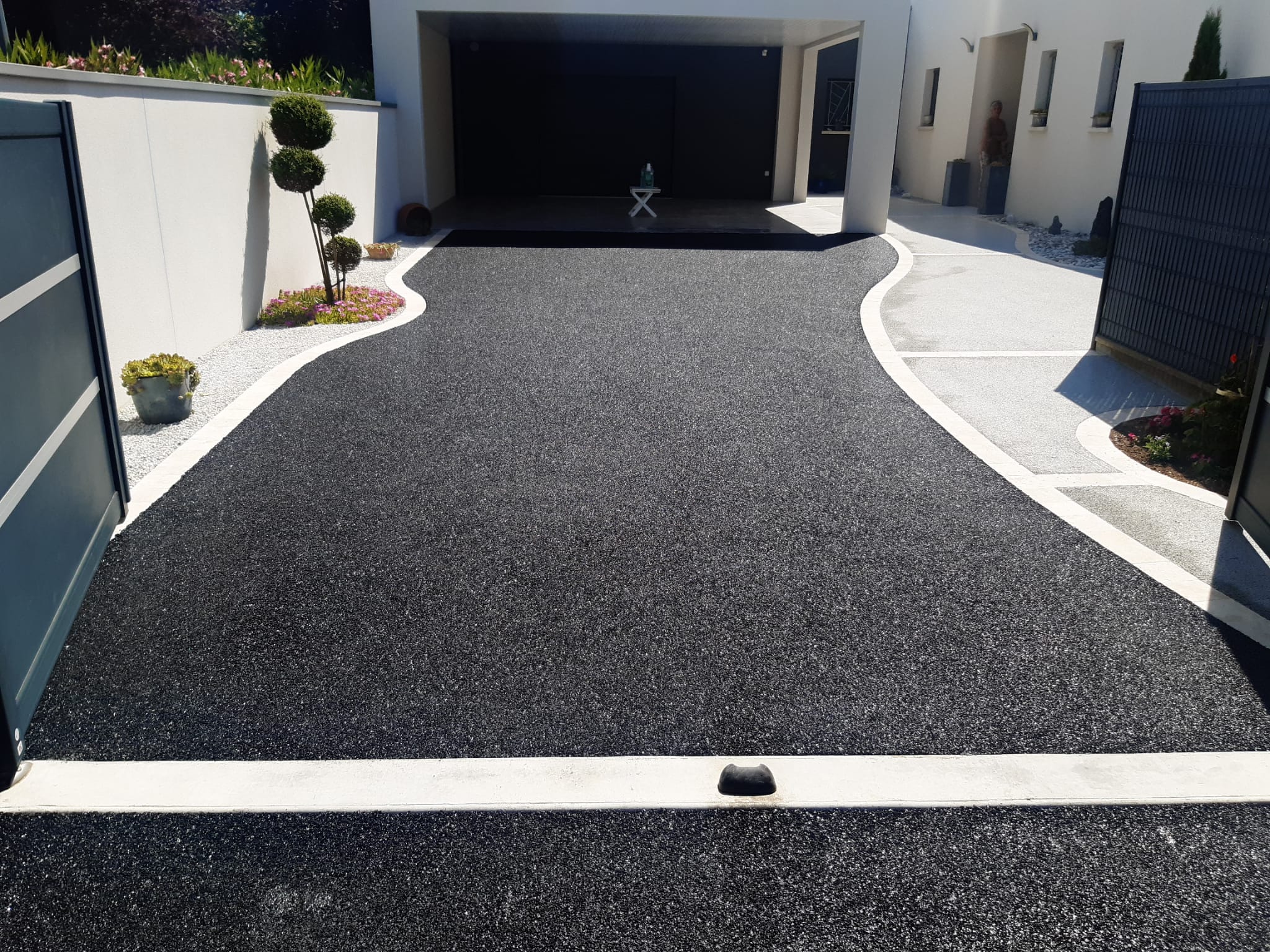 L’enrobé noir ne nécessite pas d’entretien, il grise naturellement sous l’effet des UV.