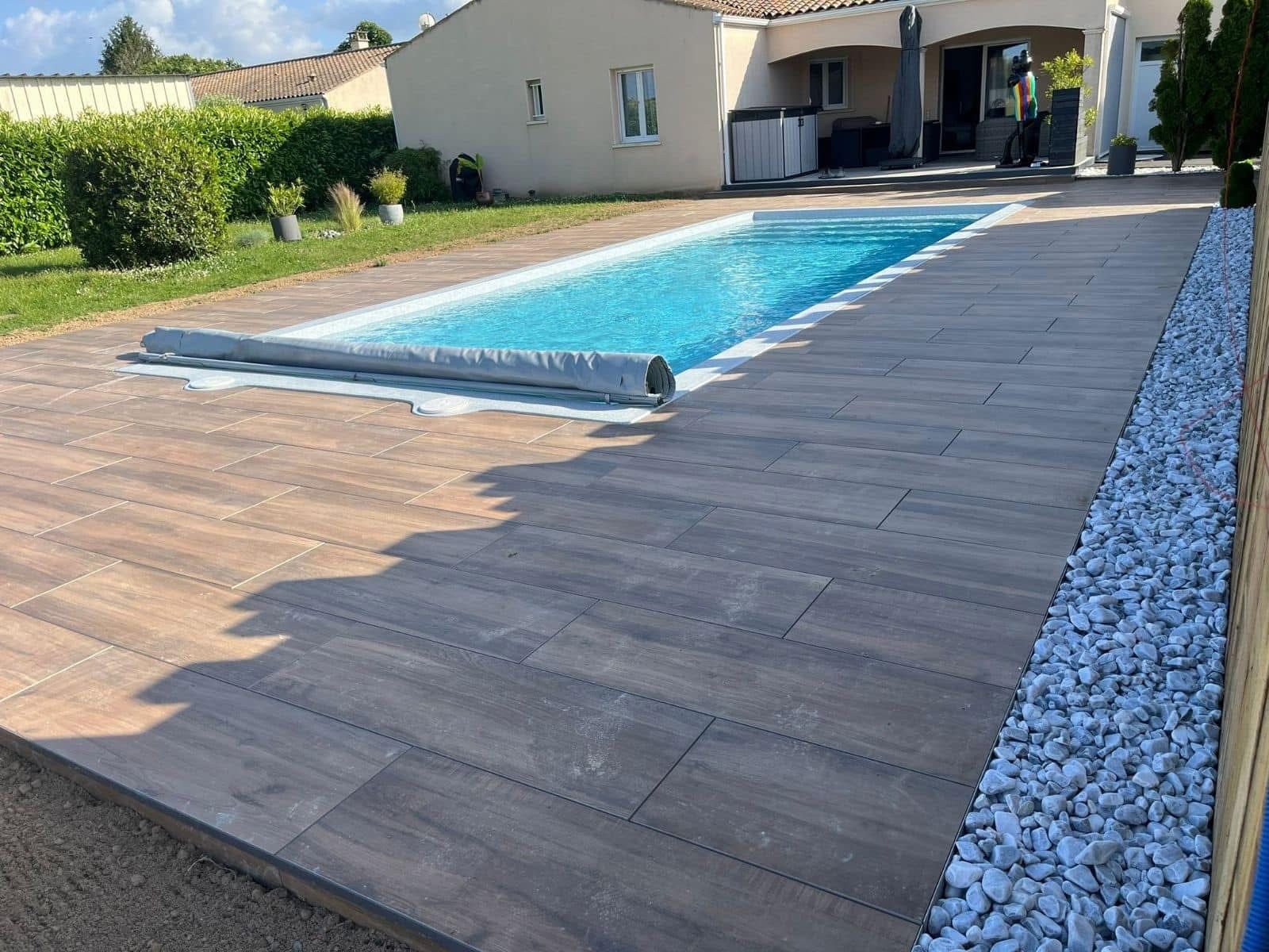 Aménagement complet autour d’une piscine existante, le tout en dalles sur plots ainsi qu’un brise-vue en poutres de chêne. Pour le régal des yeux.