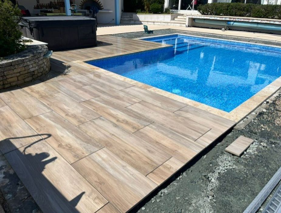 Les dalles sur plots ont été retenues afin d’aménager une terrasse au bord de la piscine.