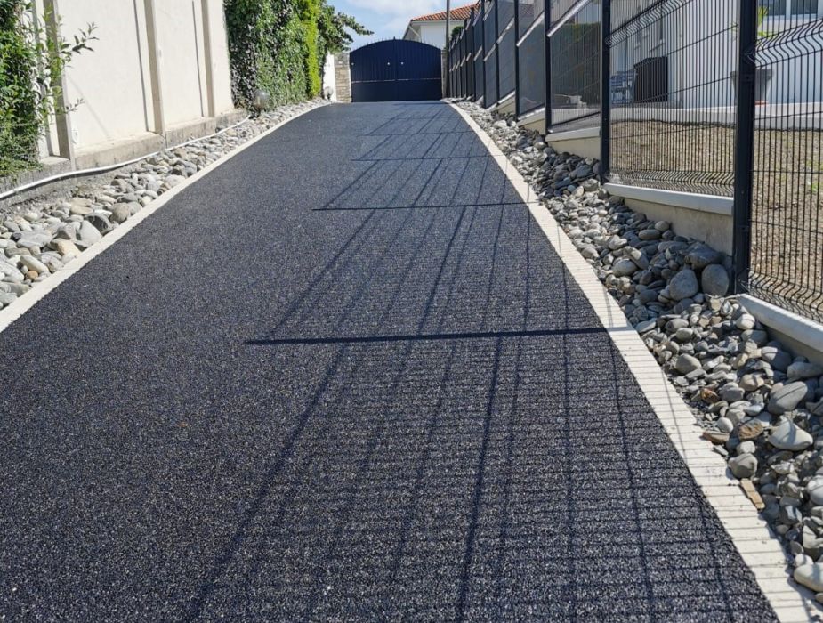 D’une allée en gravillon simple, notre client ne voulait plus d’entretien et d’arrachage des mauvaises herbes. Il a donc opté pour l’enrobé noir.