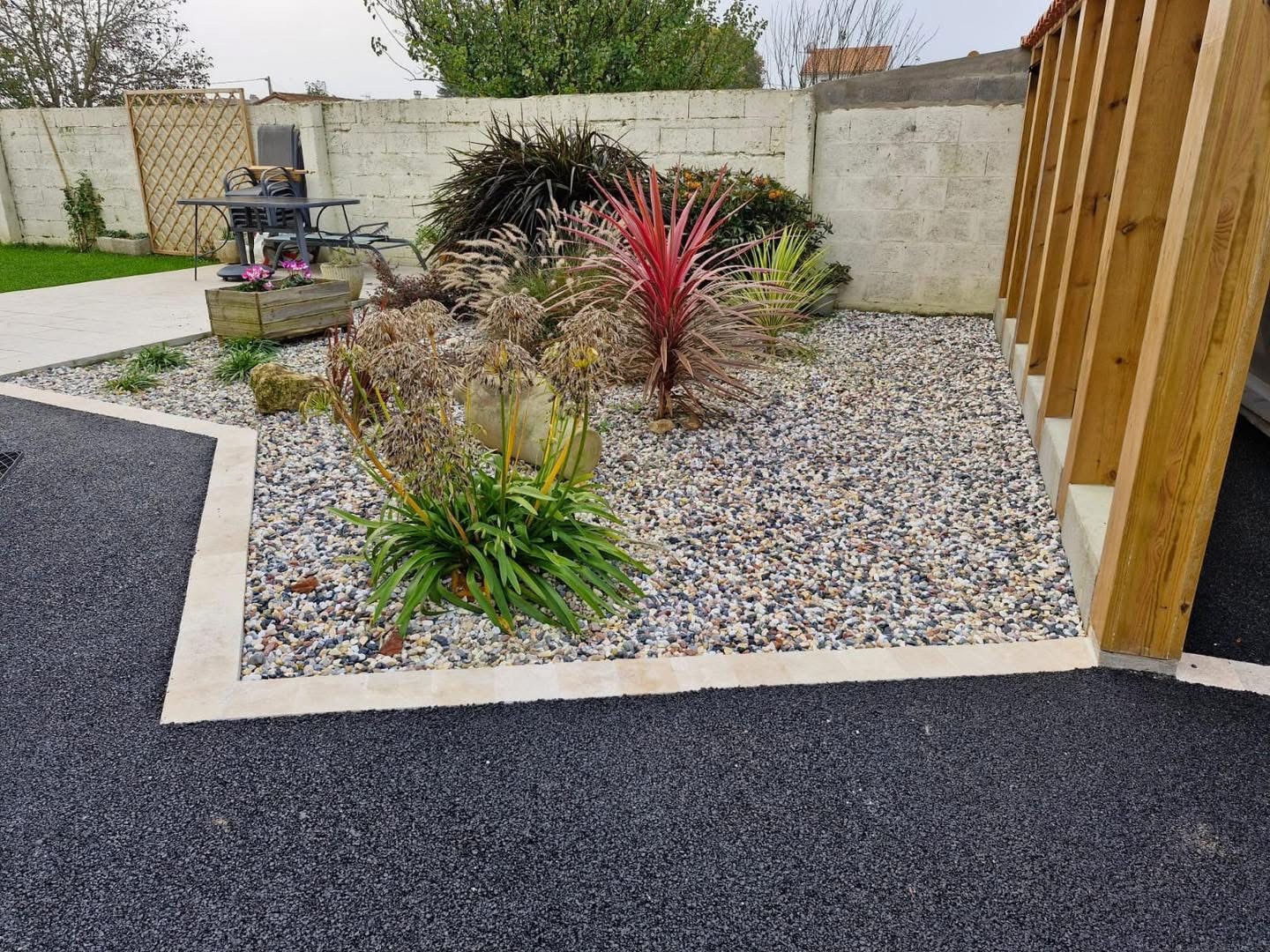 Notre cliente ne souhaitais plus de graviers dans son allée, elle a opté pour un enrobé classique noir bordé de pavés.