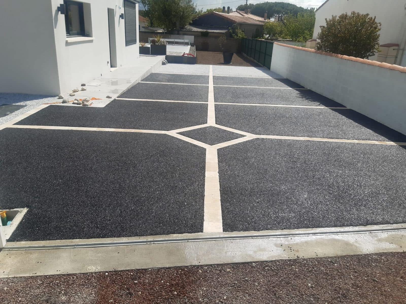 Sur cette maison récente, le client voulait un revetement sans entretien et durable. Nous avons alors proposé l’enrobé marié à des graviers stabilisés pour drainer les eaux.
