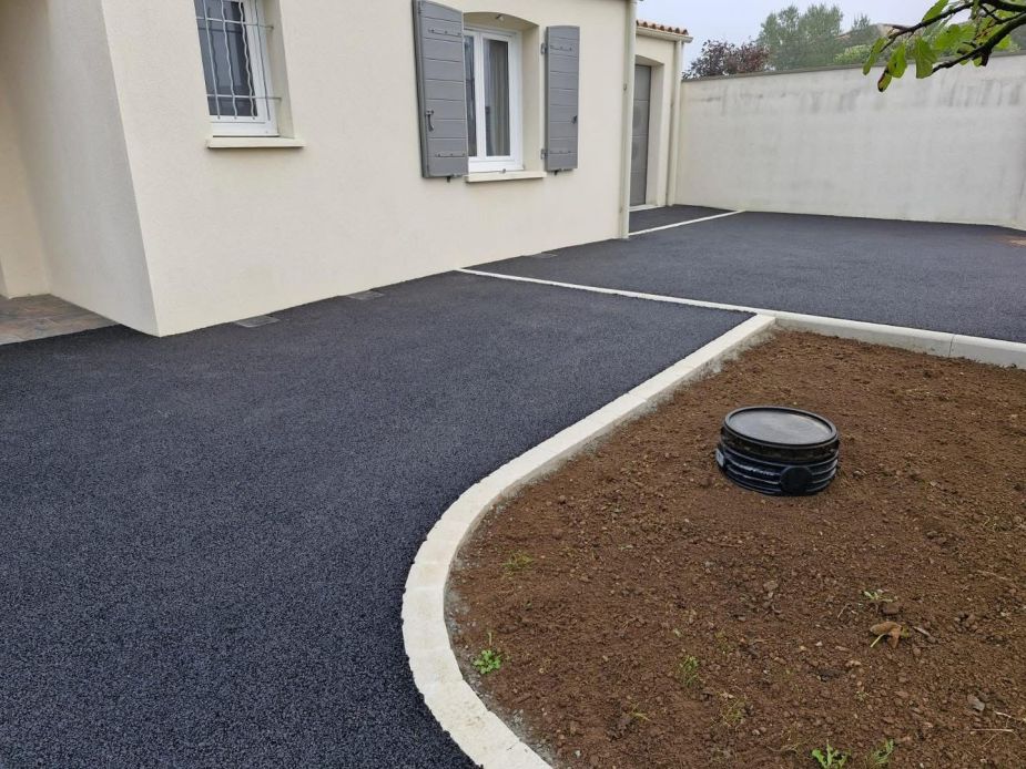L’enrobé s’imposait pour notre client qui voulait un revêtement efficace sans entretien et joli à la fois.Bordé de pavés le résultat est à la hauteur de ses espérances.