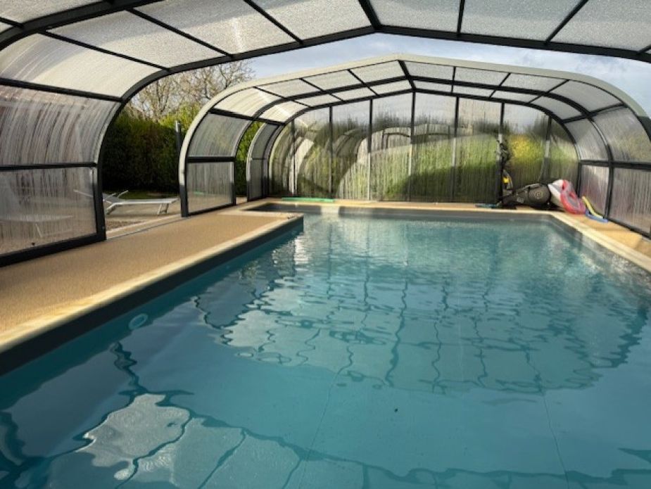 Pose de l’abri de piscine après séchage de la moquette de pierre.