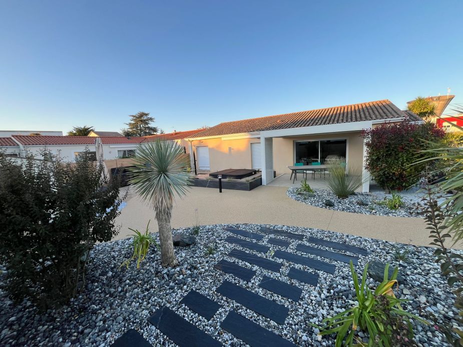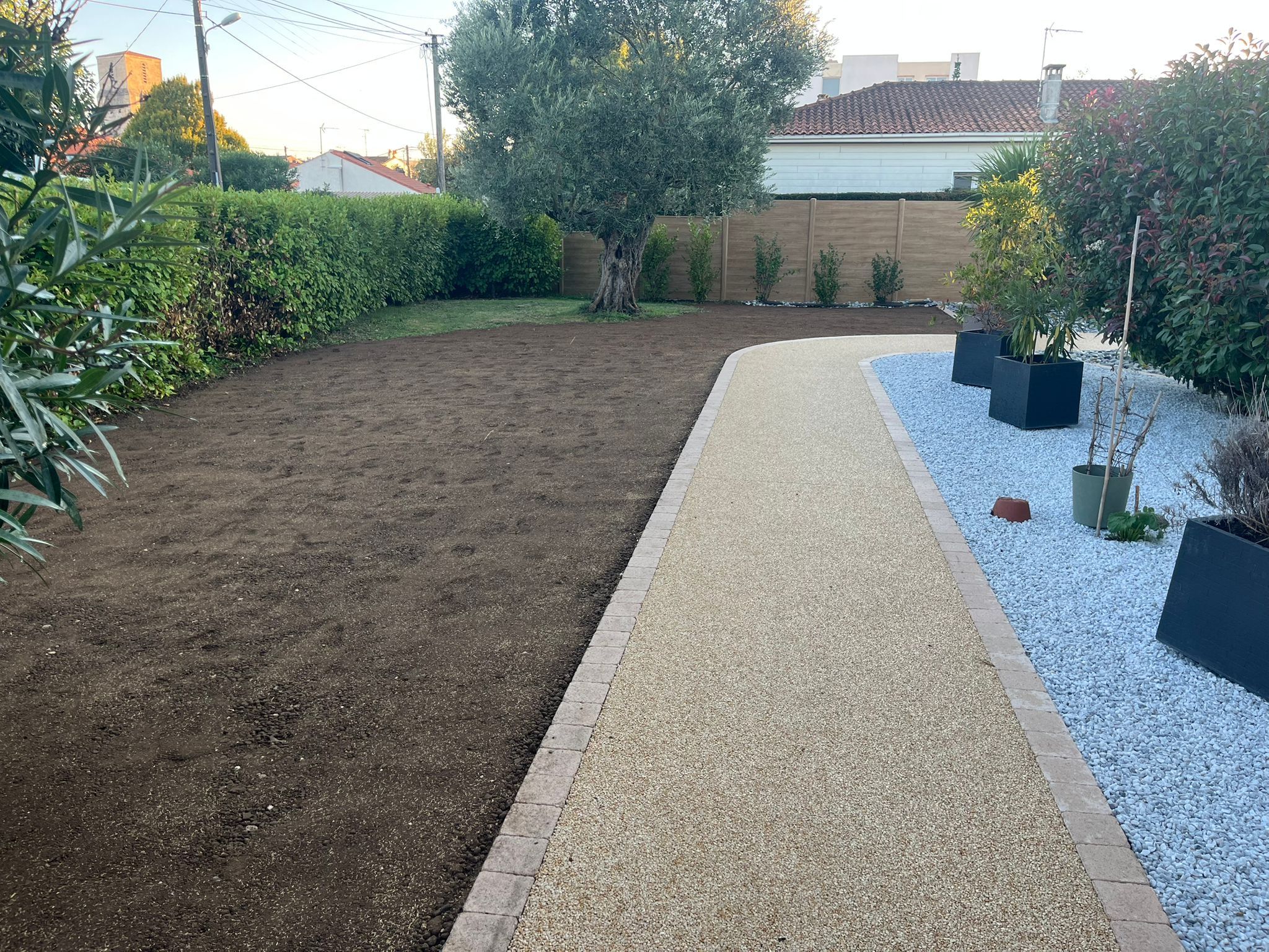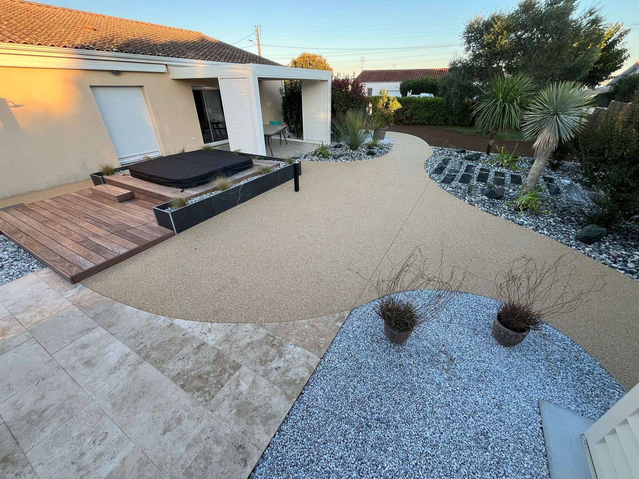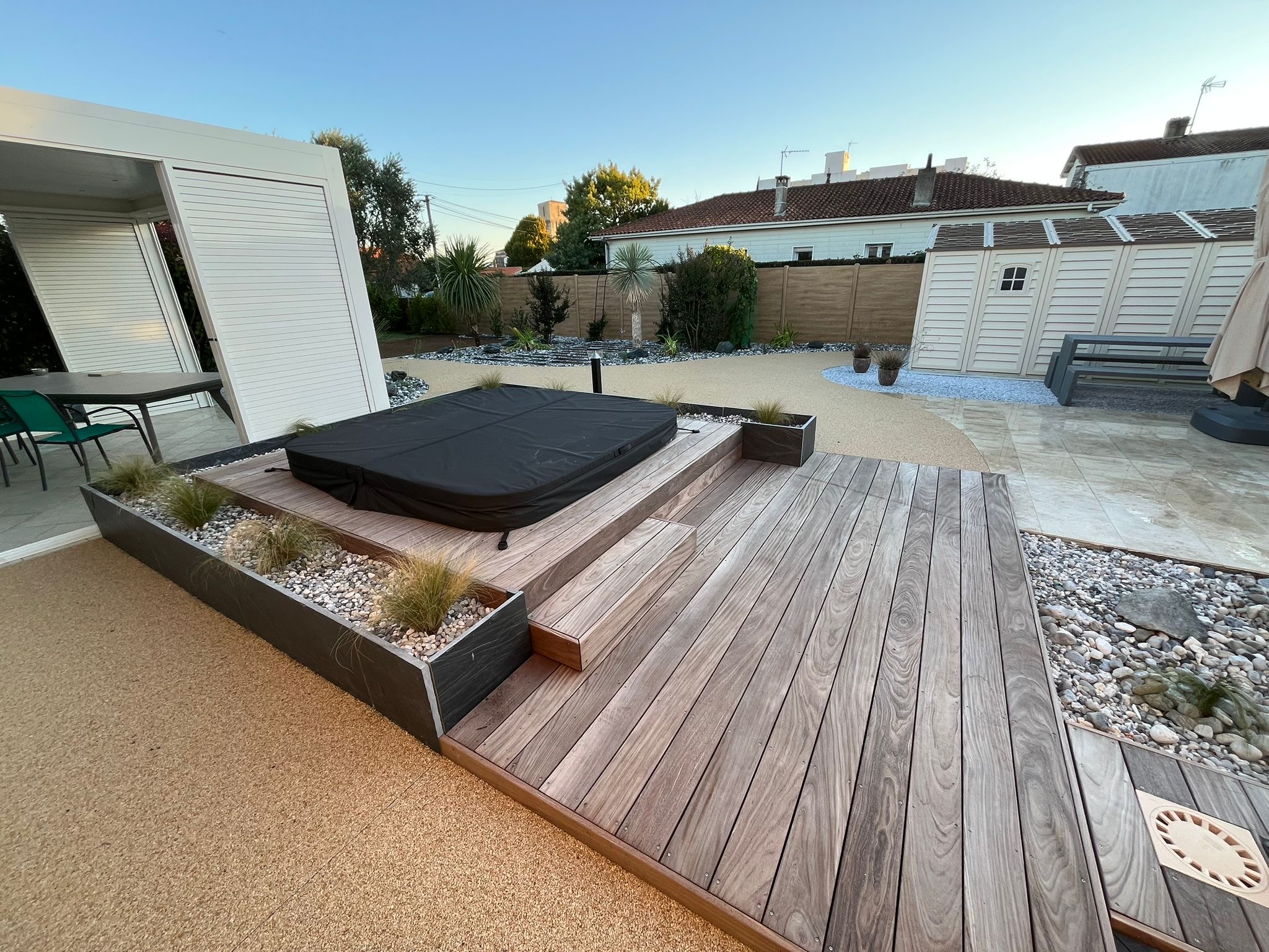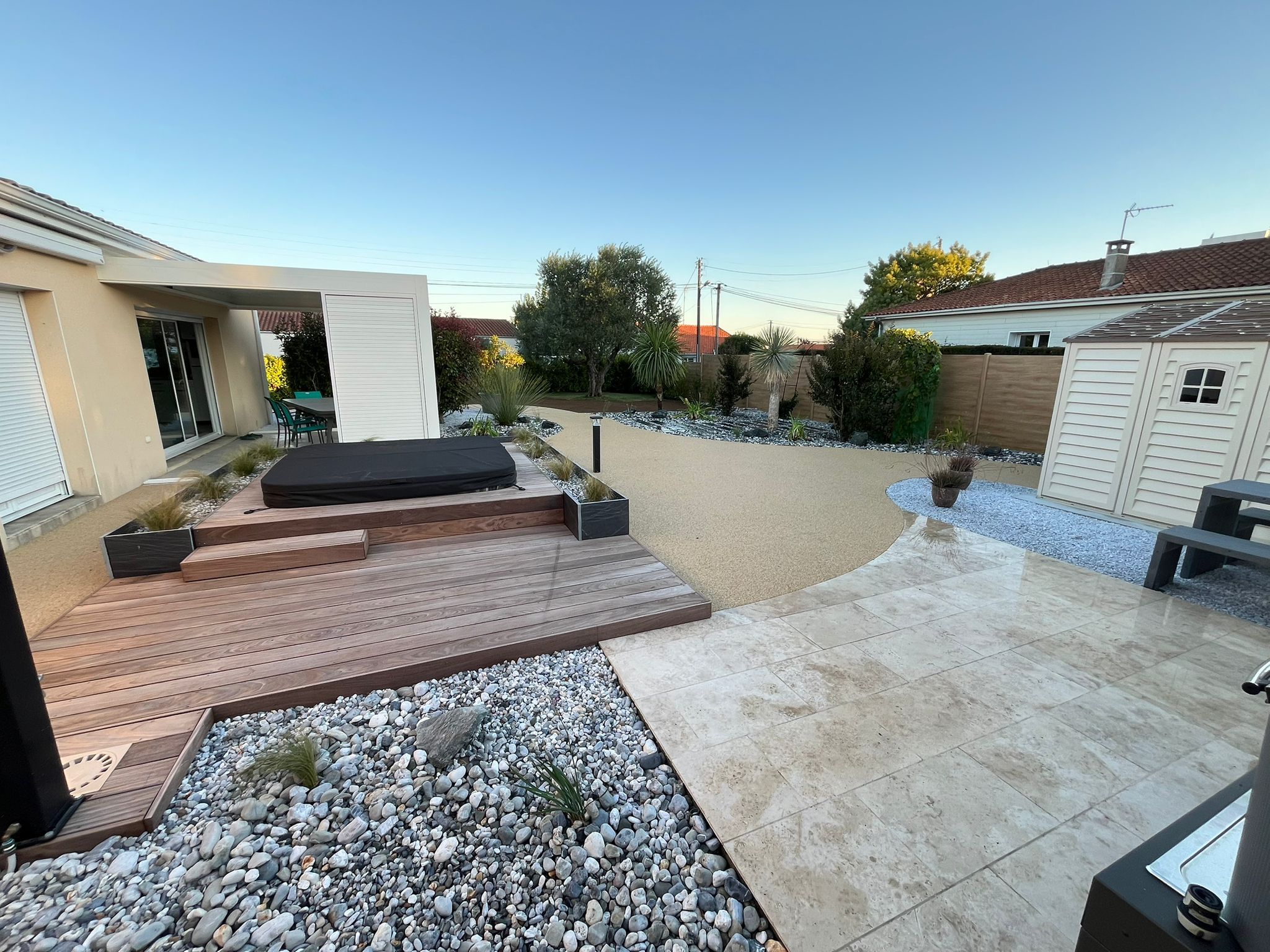Aménager son jardin en créant une terrasse, une cuisine d’été et un écrin de bien être, c’est le challenge que nous avons relevé à Royan. Nos équipes ont mis en oeuvre de la moquette de pierre sur la terrasse sous la pergola et dans l’espace de vie autour de la cuisine d’été, du béton drainant sur l’allée piétonne, une terrasse bois autour du spa et nous avons également créé des massifs paysagers pour sublimer l’ensemble.