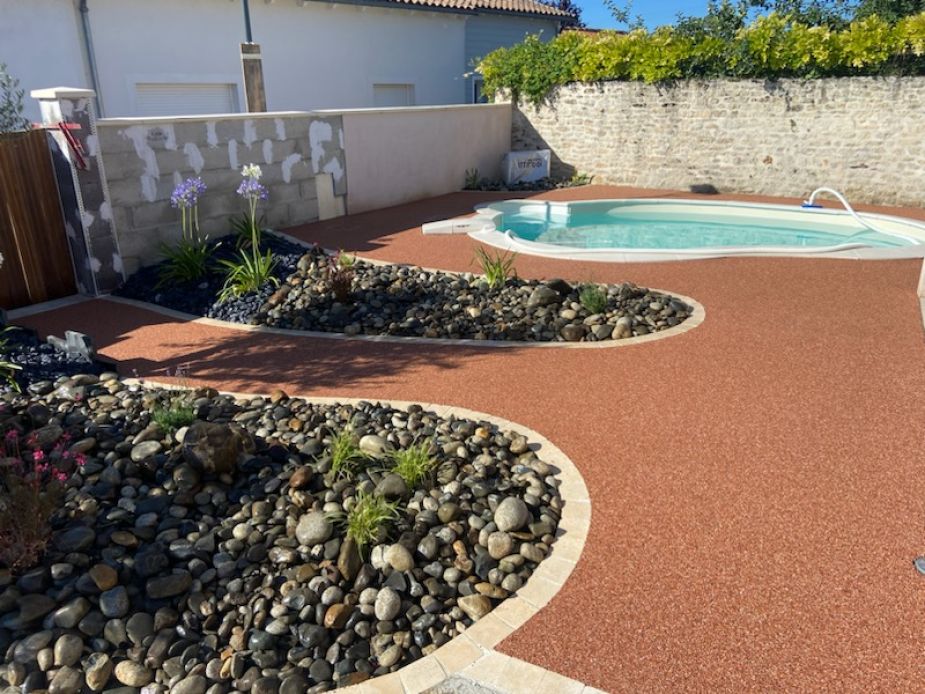 Réalisation d’une plage de piscine et terrasse en Moquette de pierre Terracota sur dalle de béton drainant pour infiltrer les eaux.