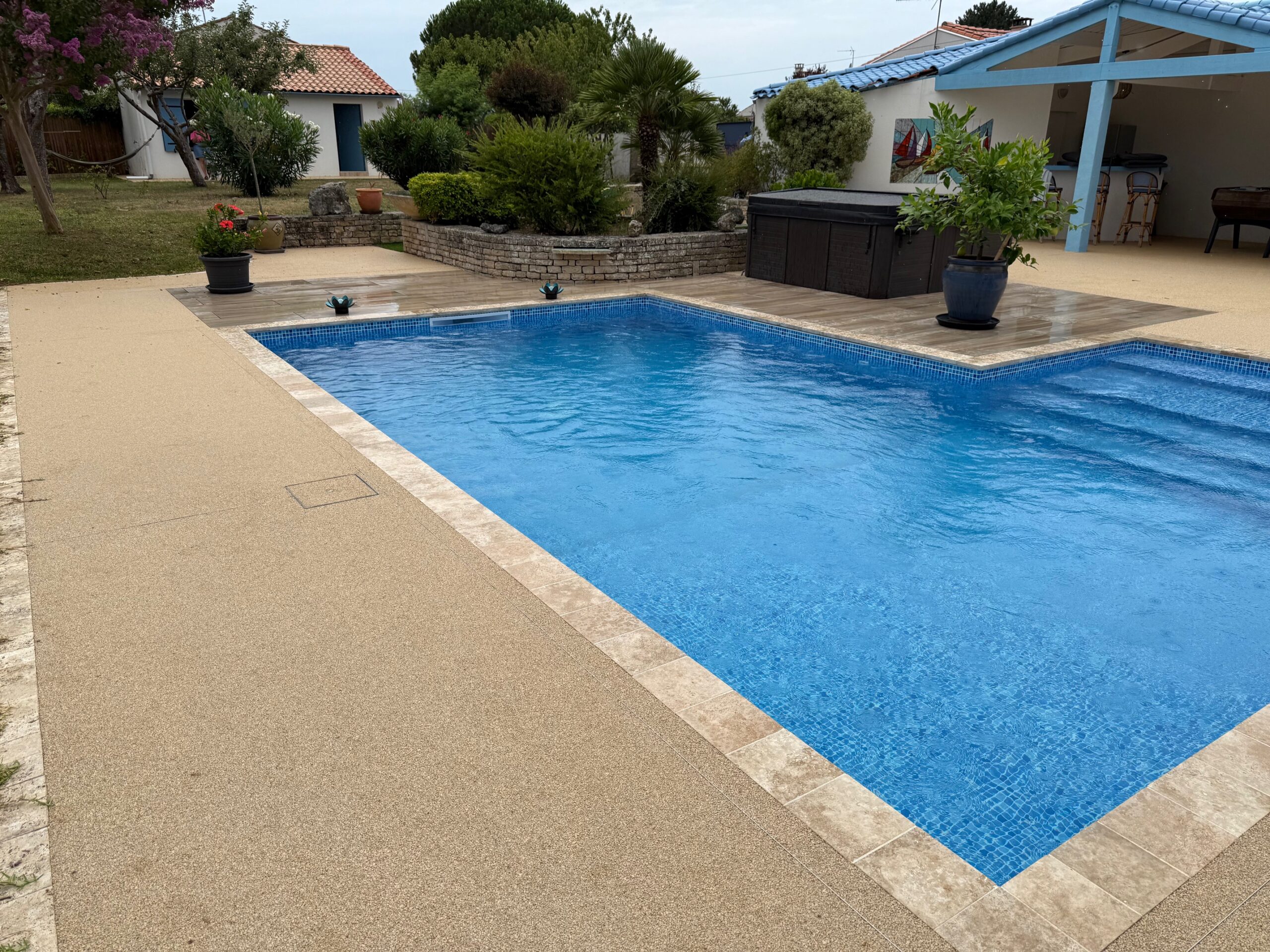 Le chantier a été la réalisation d’une plage de piscine en moquette de pierre