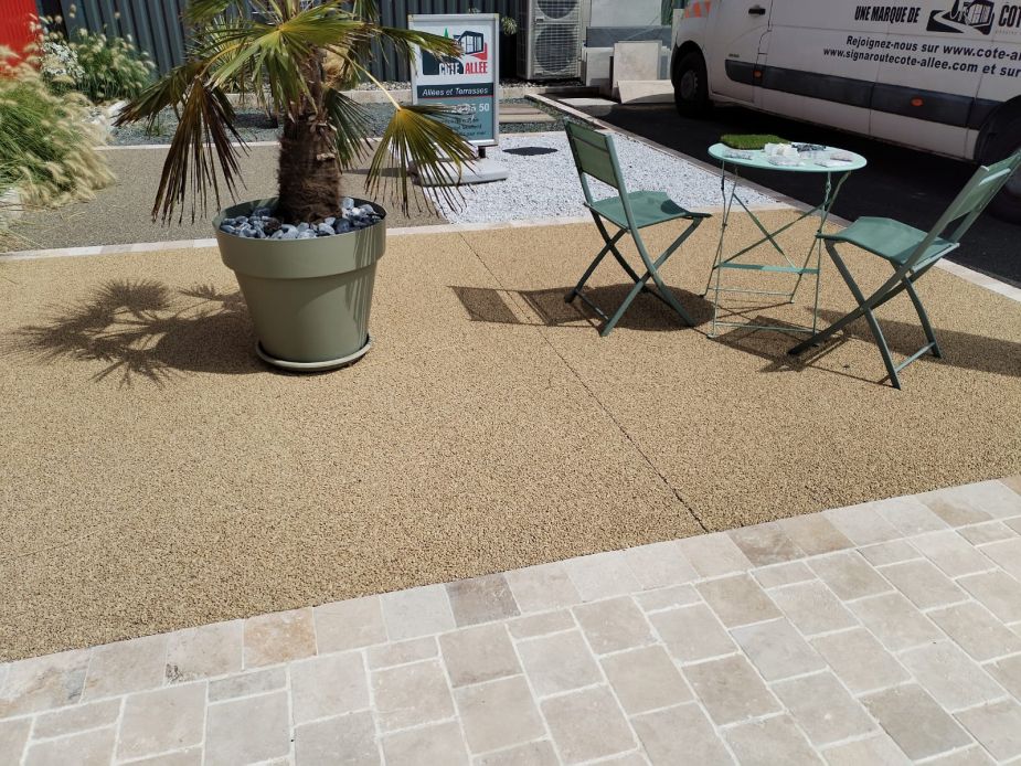 Remplacement de pavés autobloquants par une résine moquette de pierre couleur SAFRAN de chez RESINEO.