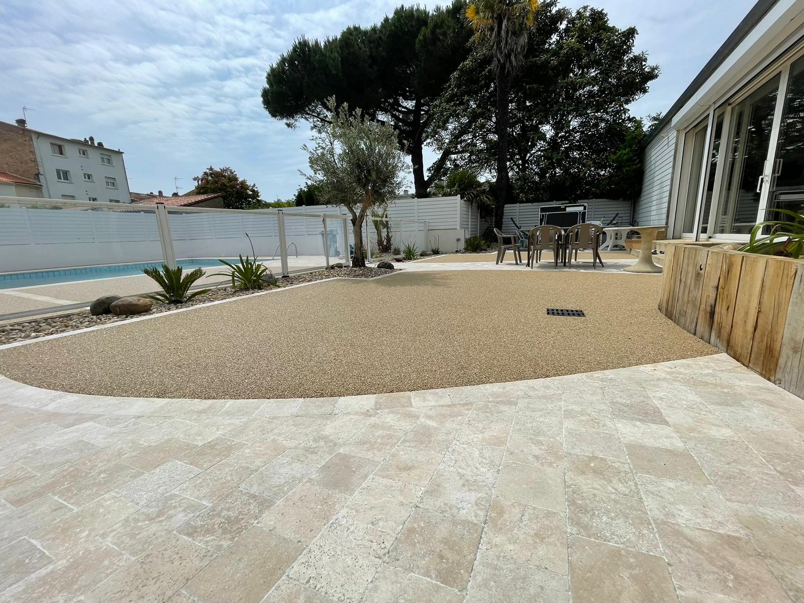 Remplacement de dalles gravillonnées vieillissantes par de la moquette de pierre couleur SAFRAN