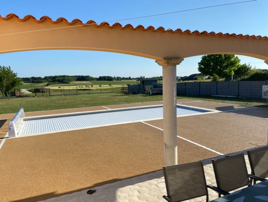 Réalisation d’une plage de piscine en béton drainant et moquette de pierre